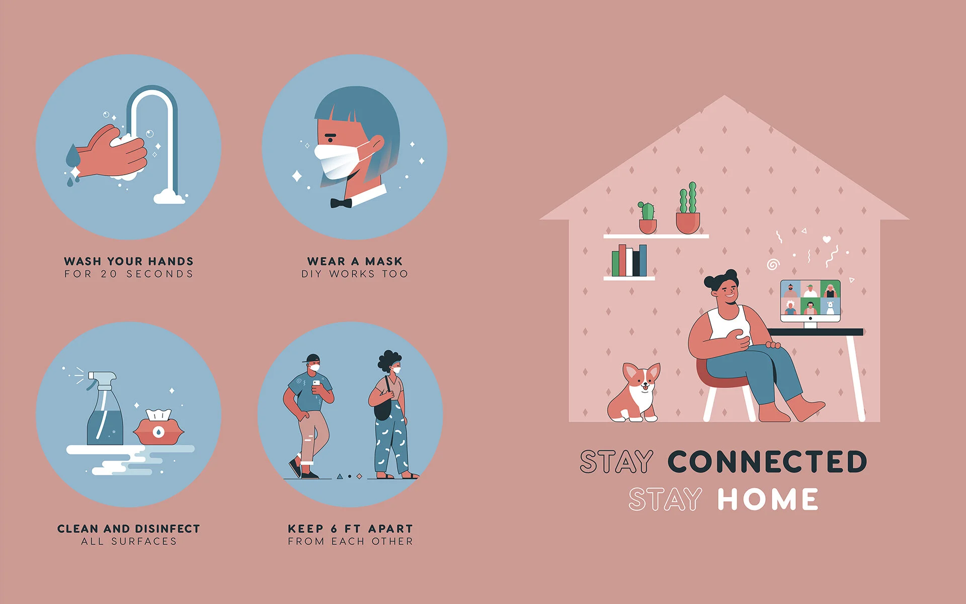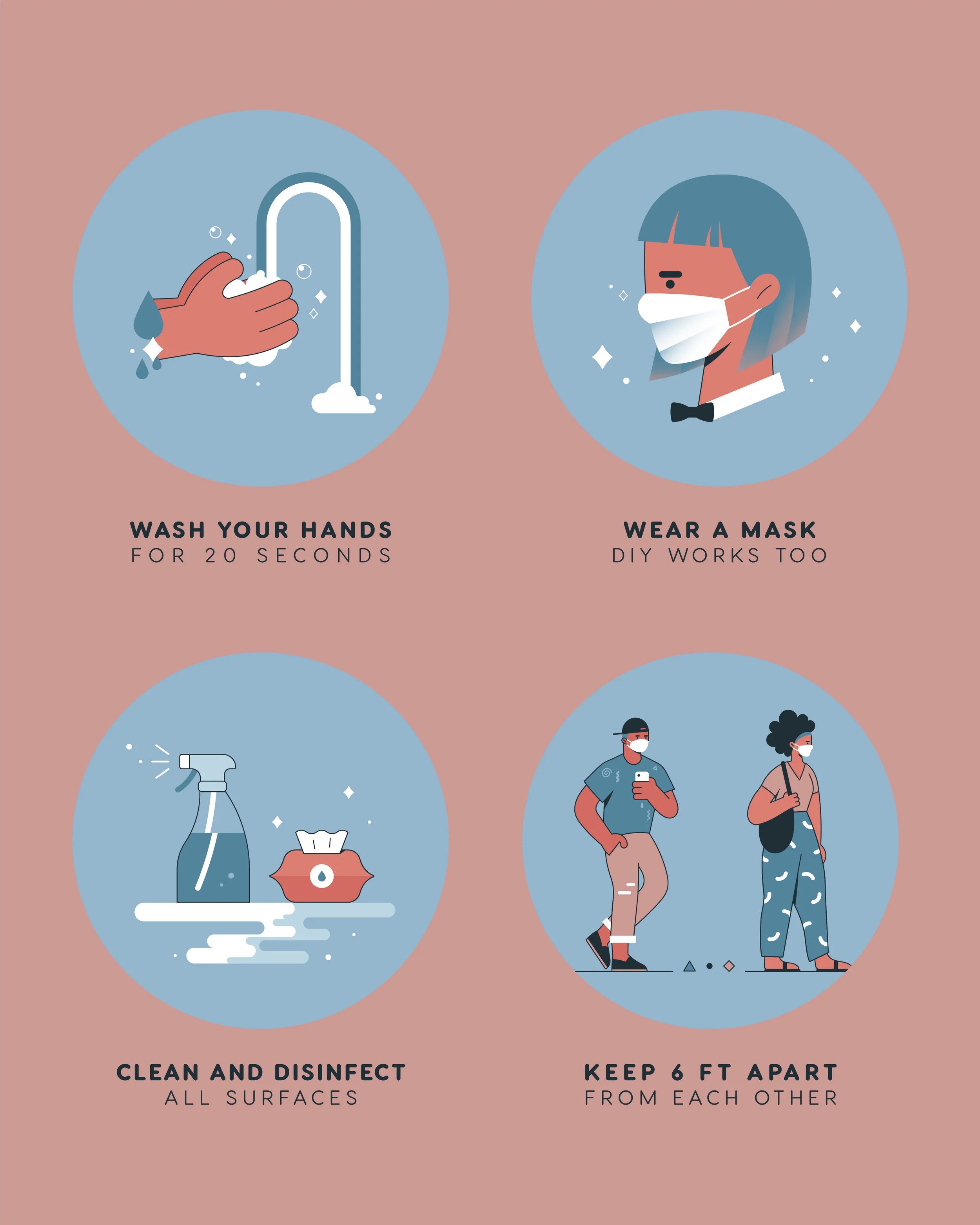 Poster on COVID-19 illustrating guidelines set by CDC (Centers for Disease Control and Prevention). Created illustrations to help educate the public on the steps to take in order to protect against COVID-19. The goal of these illustrations was to quickly deliver to the public the most current guidelines set by CDC in a simple and clean style to facilitate and expedite mass consumption.